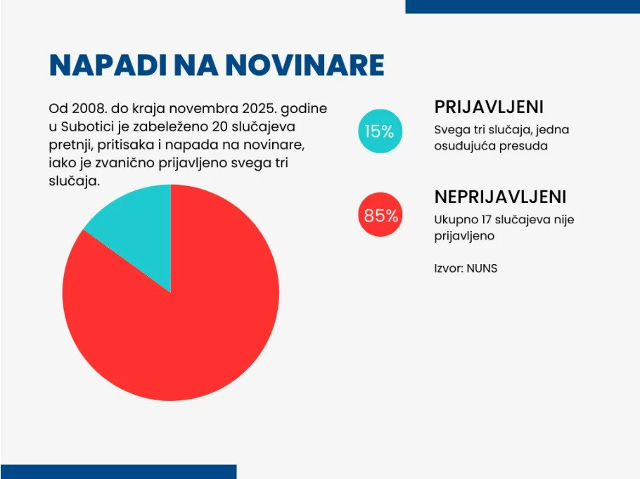 Prema NUNS-ovoj bazi podataka, od 2008. do kraja novembra 2025. godine u Subotici je bilo zabeleženo 20 slučajeva pretnji, pritisaka i napada na novinare, dok je zvanično prijavljeno svega tri.